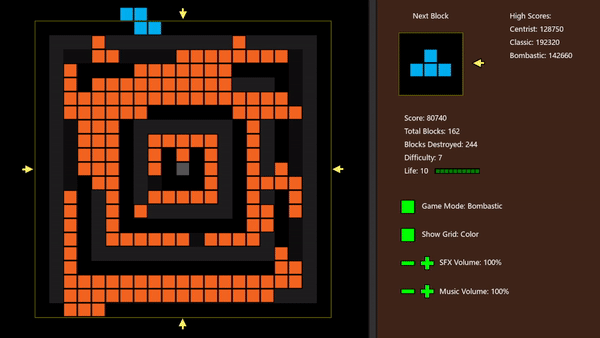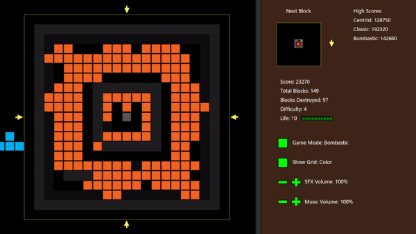 Centrist is a block stacking game where your goal is to place blocks around the center piece in a perfect square formation. Blocks will appear from 4 different directions. The game gets harder as you destroy more blocks.