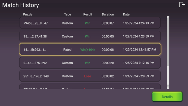 See the results of recent matches, see your win rate for a specific puzzle, and the personal record, etc. It's handy if you want to retry a previously failed puzzle, or if you want to break the personal record of a specific puzzle.