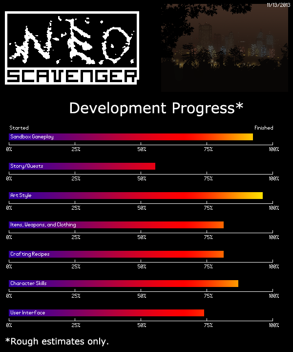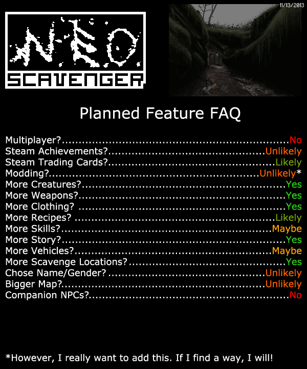 NEO Scavenger is a game where you must survive in the wasteland long enough to figure out who you are. Each turn, you must decide where to go, how to scavenge for supplies, and how to deal with anything and anyone you encounter. And with each passing minute, the pit in your stomach grows, your dehydration worsens, your muscles tire, and your body temperature drops in the cold autumn air. Choose your starting abilities carefully, because they and your wit are the only tools you have in the apocalypse!