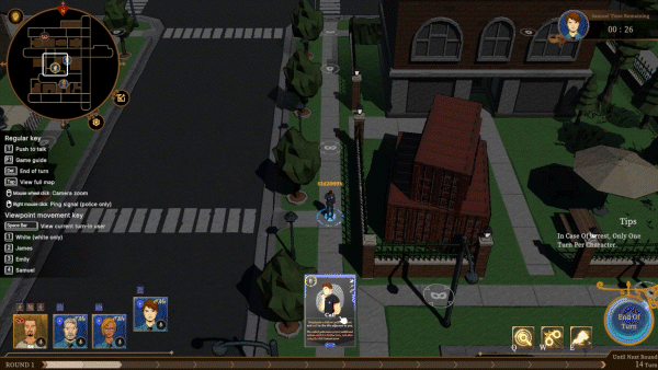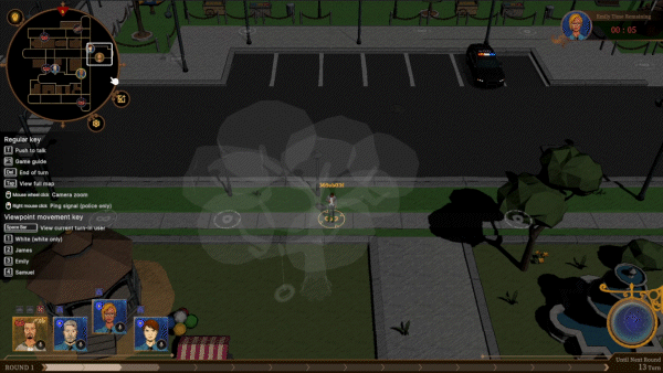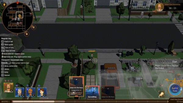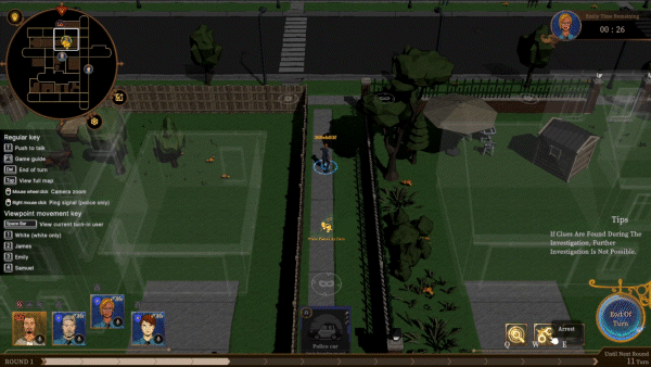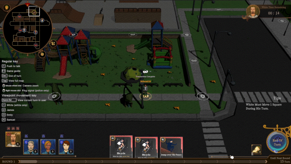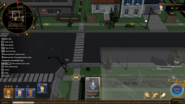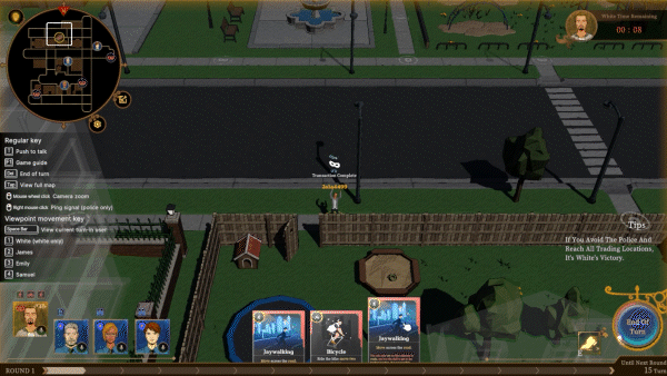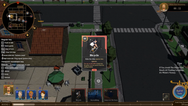 WhiteTrick is played with a conman who is defrauding second-hand goods and three police officers chasing him, and their goals vary depending on their roles. The impostor "White" can move while hidden from the three police officers, and must commit additional crimes within a set number of turns. And in order to catch White, the police can investigate White's movement path to find clues, guess his movement route, arrest him, or block his movement route to prevent further crimes.
