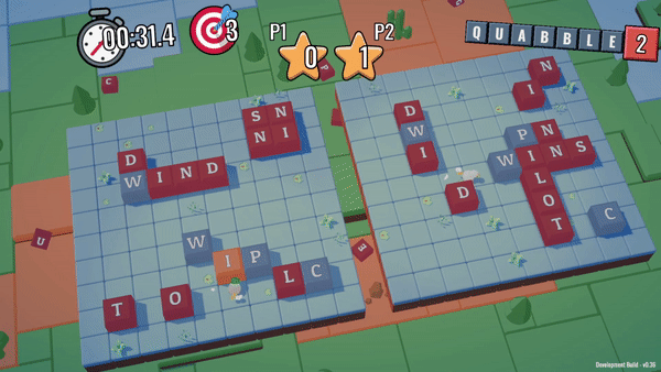 A head-to-head mode where both players receive 16 letters and 80 seconds to arrange as many words onto their board as they can. After the time is up, each player's board is scored, and the player with the most points wins the round. Best of five rounds takes the match! You must think quickly on your (webbed) feet to make as many words as you can!