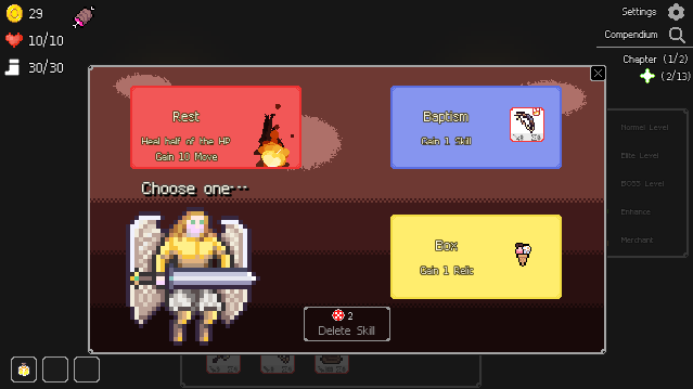 At Angel you can rest to restore health and movement, or gain a new skill, or get a relic
