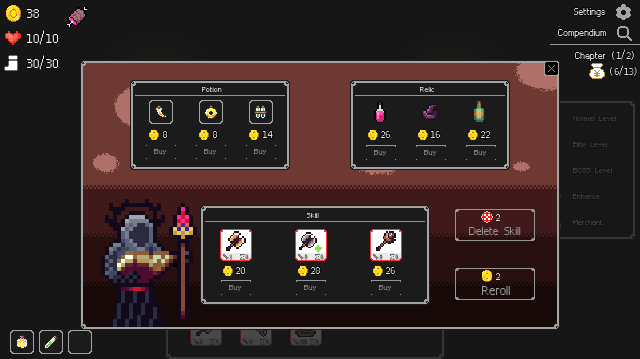In the shop you can buy potions, skills and relics, and the shop can also be refreshed