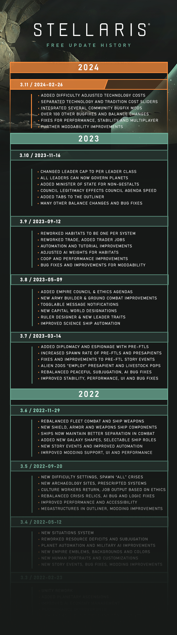 Like all our Grand Strategy games, the adventure evolves with time. Because free updates are a part of any active Paradox game, you can continue to grow and expand your empire with new technologies and capabilities. What will you find beyond the stars? Only you can answer that.