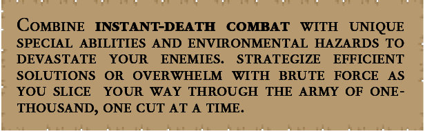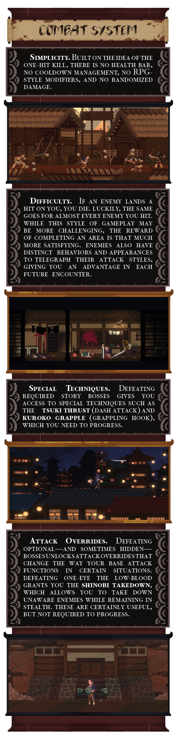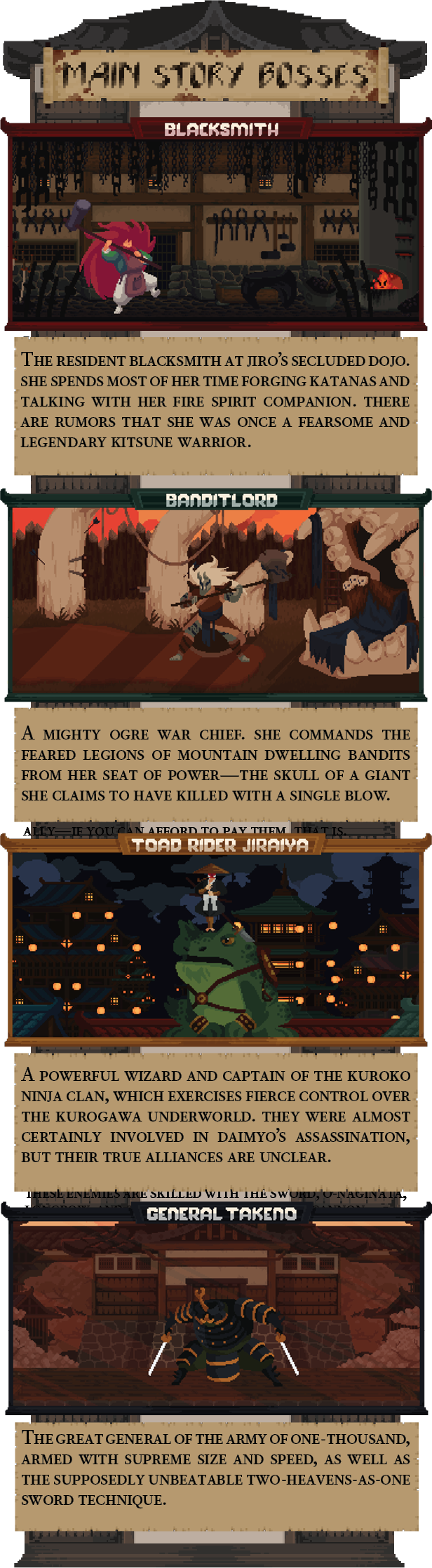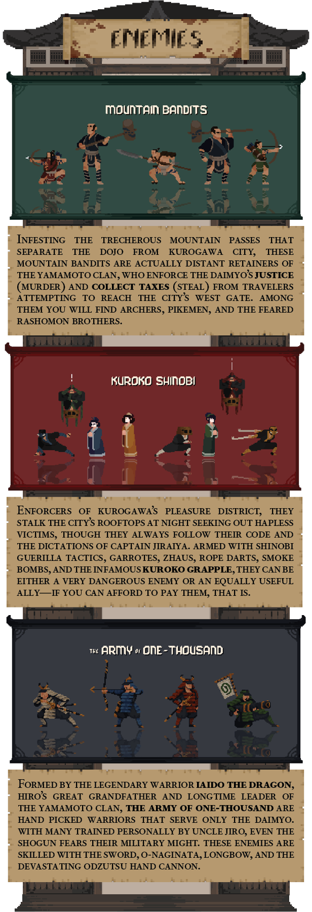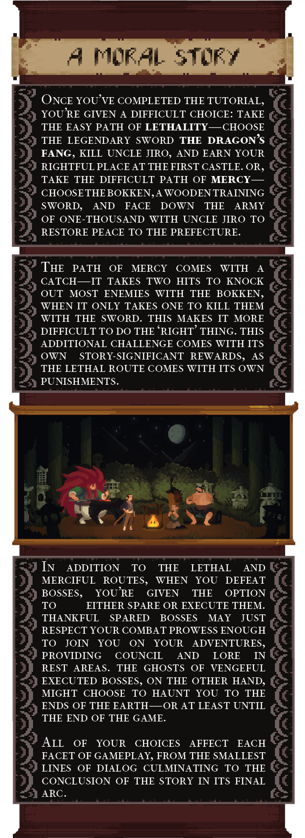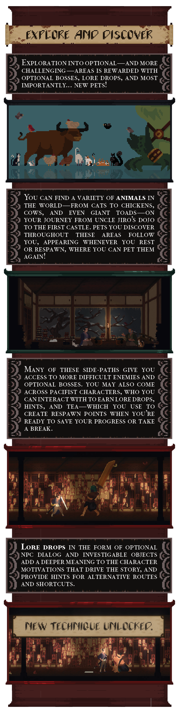 A samurai-inspired pixel-art side-scroller with simple-yet-satisfying combat, deeply consequential choices, and lore-rich storytelling. Hack and slash your way through the infamous Army of One-Thousand and reclaim your rightful place as daimyo, one cut at a time.