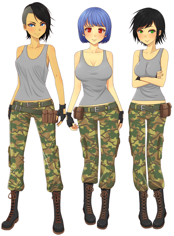 Army Gals is a visual novel set at a retreat for delinquents. The protagonist is forced to attend after a misunderstanding back at home. Expecting a fortnight of hell, he is pleasantly surprised to find he is sharing the retreat with three beautiful but very different young women.
