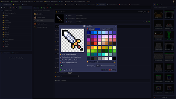 Create grid-based worlds with the tiles you've built, then bring them to life by adding interactive NPCs and objects using the editor's intuitive navigation and interaction system.