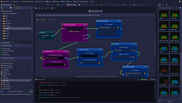Set up and trigger in-game events with the visual, node-based script editor. Simply drag and drop the desired actions (no programming knowledge required), or manually code "quick scripts" using Bauxite, the custom, Lua-like scripting language.