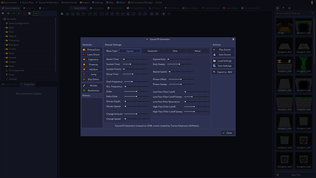 Generate fun, retro-style sound effects using the built-in tool based on Dr. Petter’s SFXR.