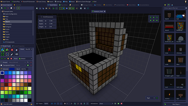 Build tiles, objects, and characters from 3D pixel blocks (i.e. voxels) and easily animate them with the editor's frame-based, stop-motion animation system. Importing from MagicaVoxel (.vox) and Qubicle (.qb) is also supported.