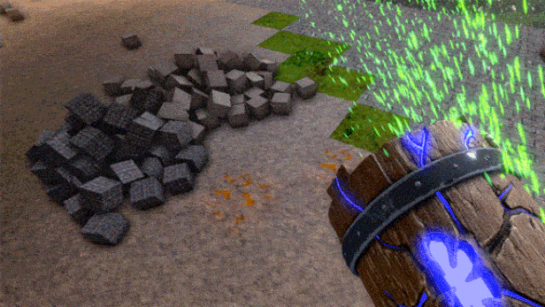 Great building controls, designed from the ground up for VR! You can mine, collect and charge magic crystals to conveniently place up to 9 blocks at once.