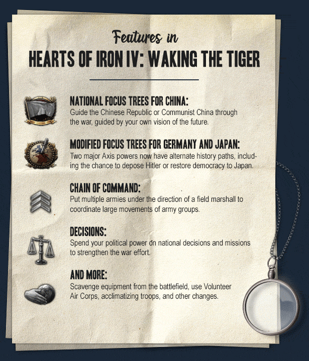 Waking the Tiger is the newest expansion for Paradox Development Studio’s celebrated World War II strategy wargame, Hearts of Iron IV. This expansion adds new gameplay options for all players, and has a special focus on the Asian front of the deadliest war in human history.