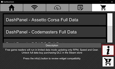 Widget compatibility varies for each game. Review widget compatibility by pressing the info (i) button in the DashPanel store tab:
