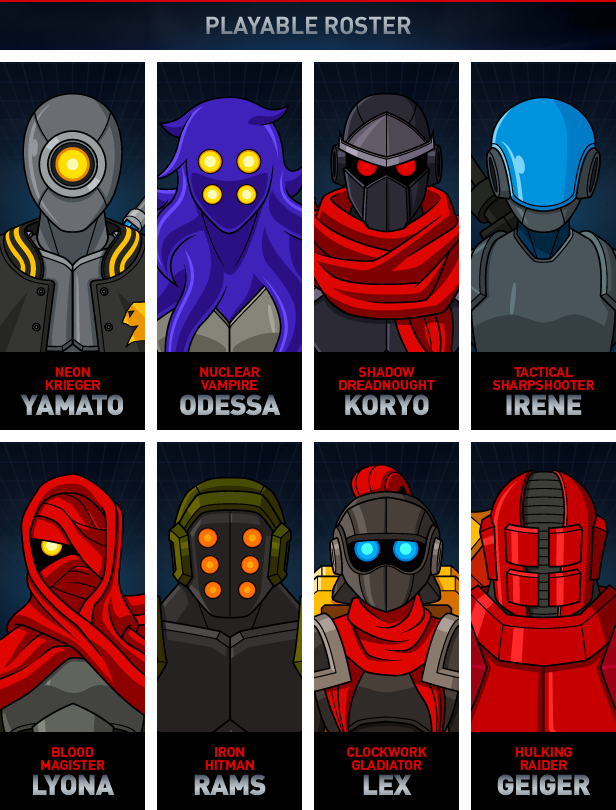 Relive the arcade era! Select from 8 unique characters and brawl your way to victory - solo or with a friend! A genre mashup of Japanese 90s gaming, it mixes stylish combos, sidescrolling action, and twitch combat puzzles, set in a pixel art cyberpunk world harkening to the days of 16 bit.