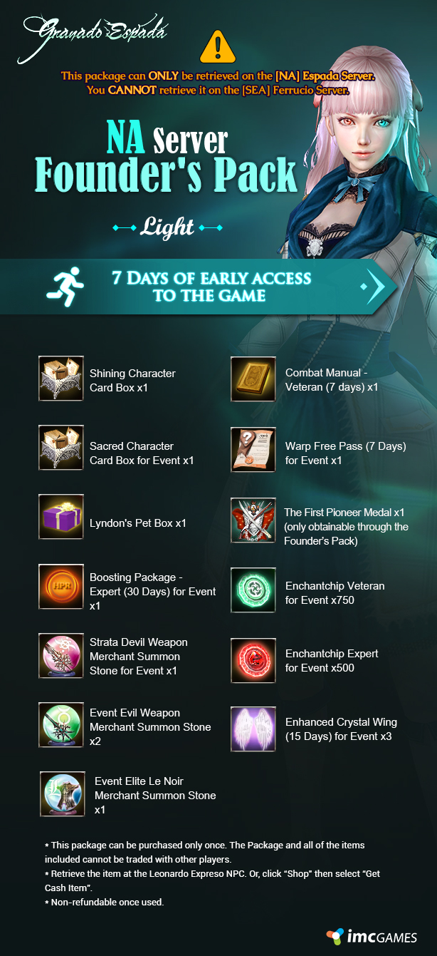 GE NA Server Founder's Pack - LightIMPORTANT* This package can ONLY be retrieved on the [NA] Espada Server. You CANNOT retrieve it on the [SEA] Ferrucio Server.* This package can be purchased only once. The Package and all of the items included cannot be traded with other players.* Retrieve the item at the Leonardo Expreso NPC.