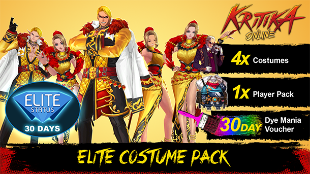 The Gold Raider Elite Costume Pack contains the tools and supplies you’re most likely to want during your first month of playing Kritika Online, including:Elite Status Voucher (30 days)Dye Mania Voucher (30 days)Smart Start Pack (×1)Costumes (×4)