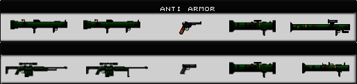 Grenade launcher with high explosive and armor piercing shells, revolver, disposable anti-tank missile, disposable anti-air missile.