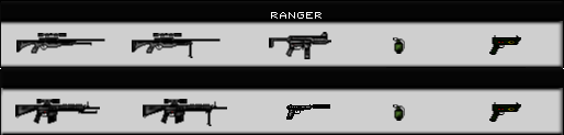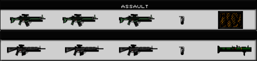 Automatic rifle, under-barrel grenade launcher for explosive rounds and smoke, flash-bang (briefly blinds anyone near explosion), sandbags (constructs sand terrain at dropped position).