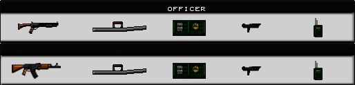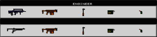 Shotgun, riot-shield (blocks small-arms fire, has limited HP), extra ammunition (re-supplies target player ammo), scope (enables very long view-distance, thermal imaging and can place target lasers), radio (can call in airstrikes on friendly lazed targets).