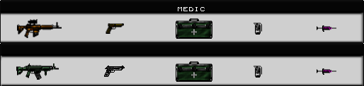 Burst fire-mode rifle, fully automatic pistol, medical kit (heals target player), smoke grenade (deploys smoke barrier on explosion), syringe (increases max HP for target player).