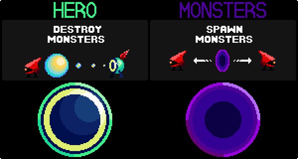 When the match starts the HERO player opens his/her eyes and the MONSTERS player can use the shoulder-buttons to open and close the portals and the face buttons to spawn the monster assigned to the specific button in real-time. (the number of monsters on screen at the same time is limited)