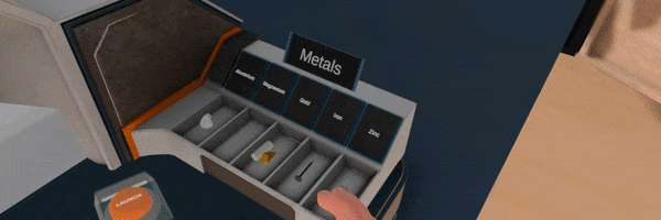 Placing different metals into water and acid introduces the player to the activity of metals. Different metals react at different speeds, and in some cases the reaction speed changes during the reaction.
