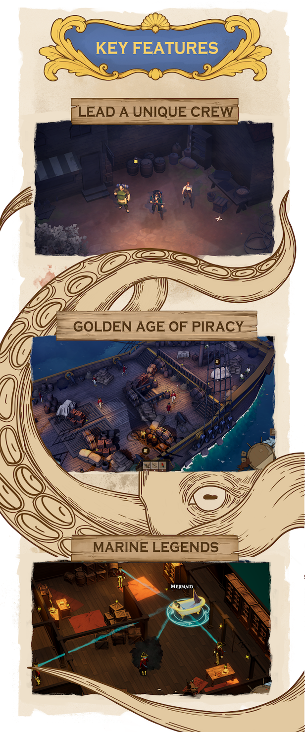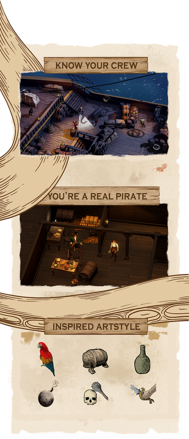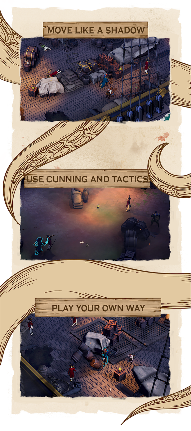 Discover the shady pasts of an aspiring captain and his crewmates. Utilize a diverse repertoire of character abilities to successfully defeat your foes. Be a quiet and elusive pirate gentleman, or a bloodthirsty murderer torturing his victims. Pay attention to your crew though, as the path you choose will inspire respect in some, while it may push others to mutiny. See what it’s like to be a true pirate captain!