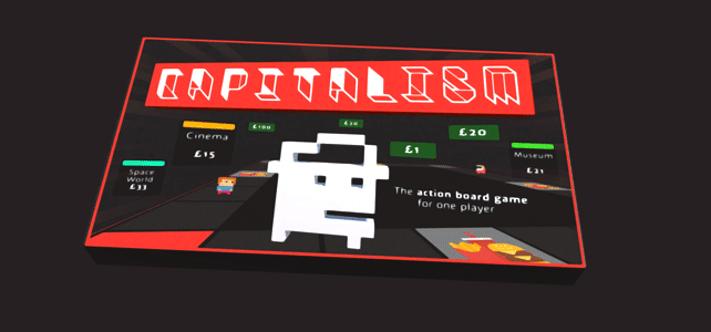'CAPITALISM The action board game for one player' is a real-time board game/ card game hybrid where your goal is to become a millionaire. Build your property empire, compete for cash prizes in high stakes mini-games, and (hopefully) earn more than you spend.